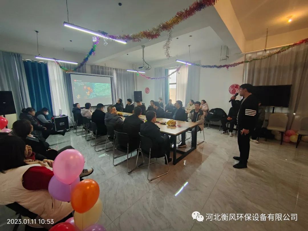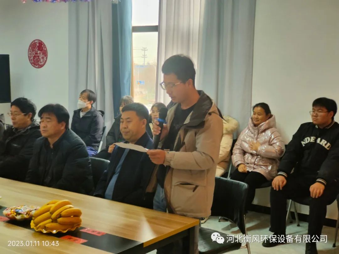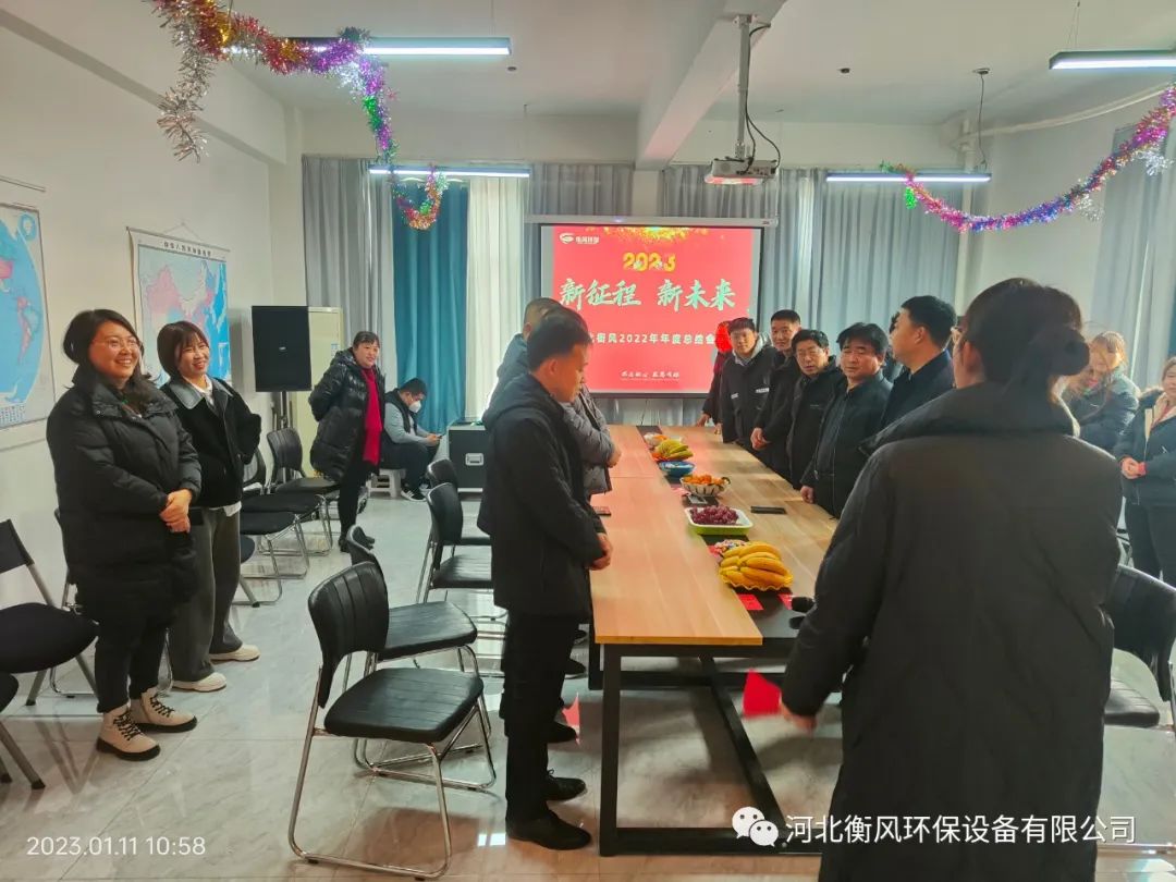 2023年1月11日上午,以“新征程 新未来”为主题的2023年年度盛典在河北衡风环保设备有限公司生产基地办公楼综合会议厅隆重召开。河北衡风环保设备有限公司总经理王春站,副总经理杨国平和各部门负责人以及全厂员工出席了本次会议。