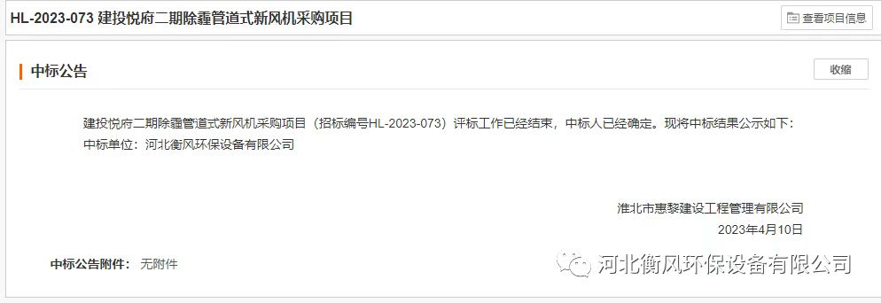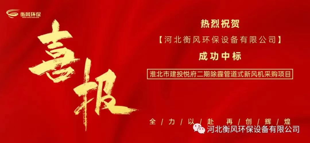 2023年4月10日,河北衡风再传喜报,公司在淮北市建投悦府二期除霾管道式新风机采购项目招标项目中,凭借产品独特的优势的品牌认知度、和完善的售后服务方案以及众多成功案例,在众多新风品牌中脱颖而出成功中标。