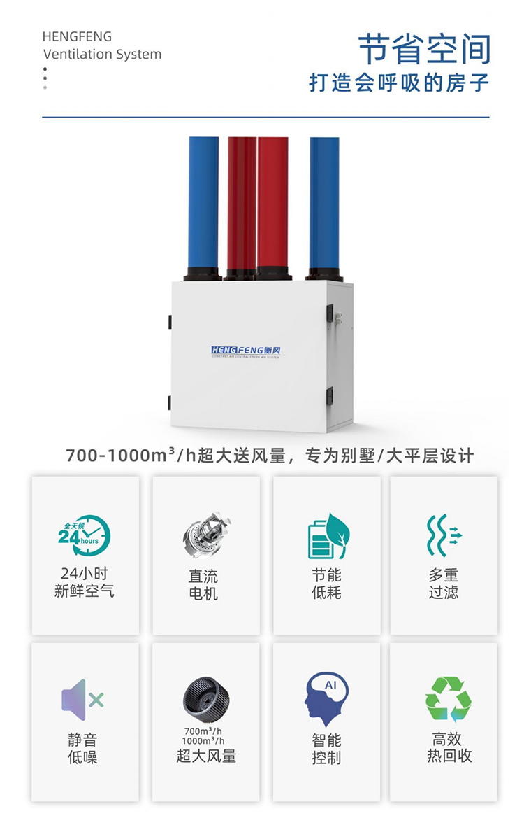 衡风橱柜式新风系统是衡风专为大平户型所设计的一款机型,此款机型和吊顶新风系统功能相仿,主要优势是后期维保方便,不占用吊顶空间,安装在设备间或者阳台即可,风机采用直流风机,风压更充沛,风压更高,机型可选装底部分风箱,可实现,地送顶回的模式。这个模式可搅动室内空气,达到了上下层空气的对流,新鲜空气慢慢上升,有害物质能够更有效地排出去。柜式新风机换热芯体采用了石墨烯高分子膜材,具有良好的透水不透气性能、gao效率回收潜热和显热、长效>99.9%抗菌和0级防霉功能、气密性高、可水洗,克服传统纸芯易发霉、不能水洗、寿命短和传统显热塑料或铝芯体能水洗但是不能进行潜热回收、产生冷凝水等缺点。