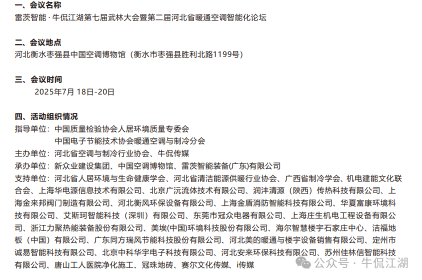 2025年7月18-20日,由中国质量检验协会人居环境质量专委会、中国电子节能技术协会暖通空调与制冷分会指导,河北省空调与制冷行业协会、牛侃传媒主办,新众业建设集团、中国空调博物馆、雷茨智能装备(广东)有限公司承办的雷茨智能・牛侃江湖第七届武林大会暨第二届河北省暖通空调智能化论坛在空调博物馆成功举办。